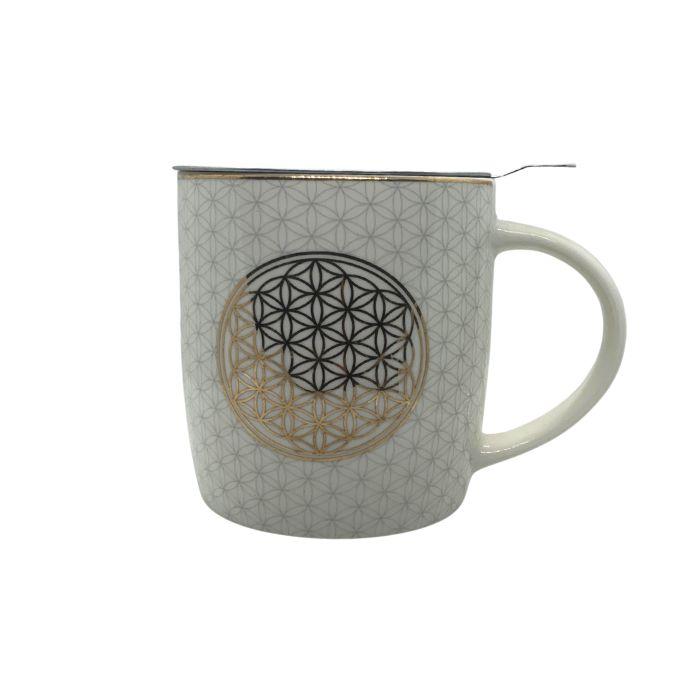 Taza de té de porcelana fina, con infusor de acero inoxidable y dibujo de flor de la vida.